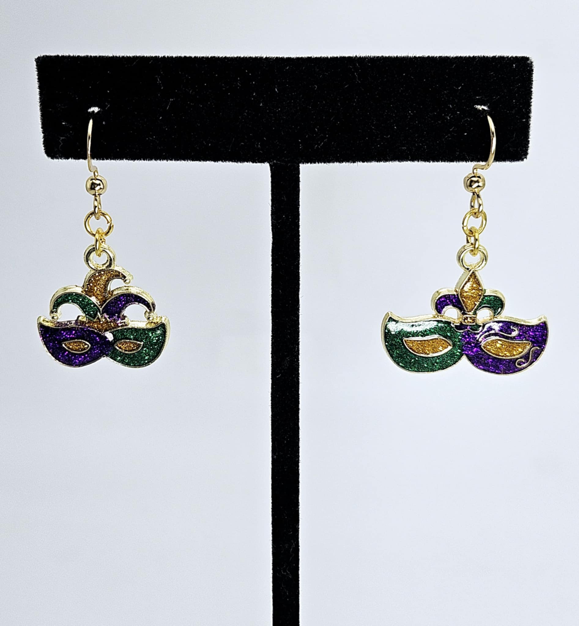Drop oil Mardi Gras earrings with gold tone hooks.