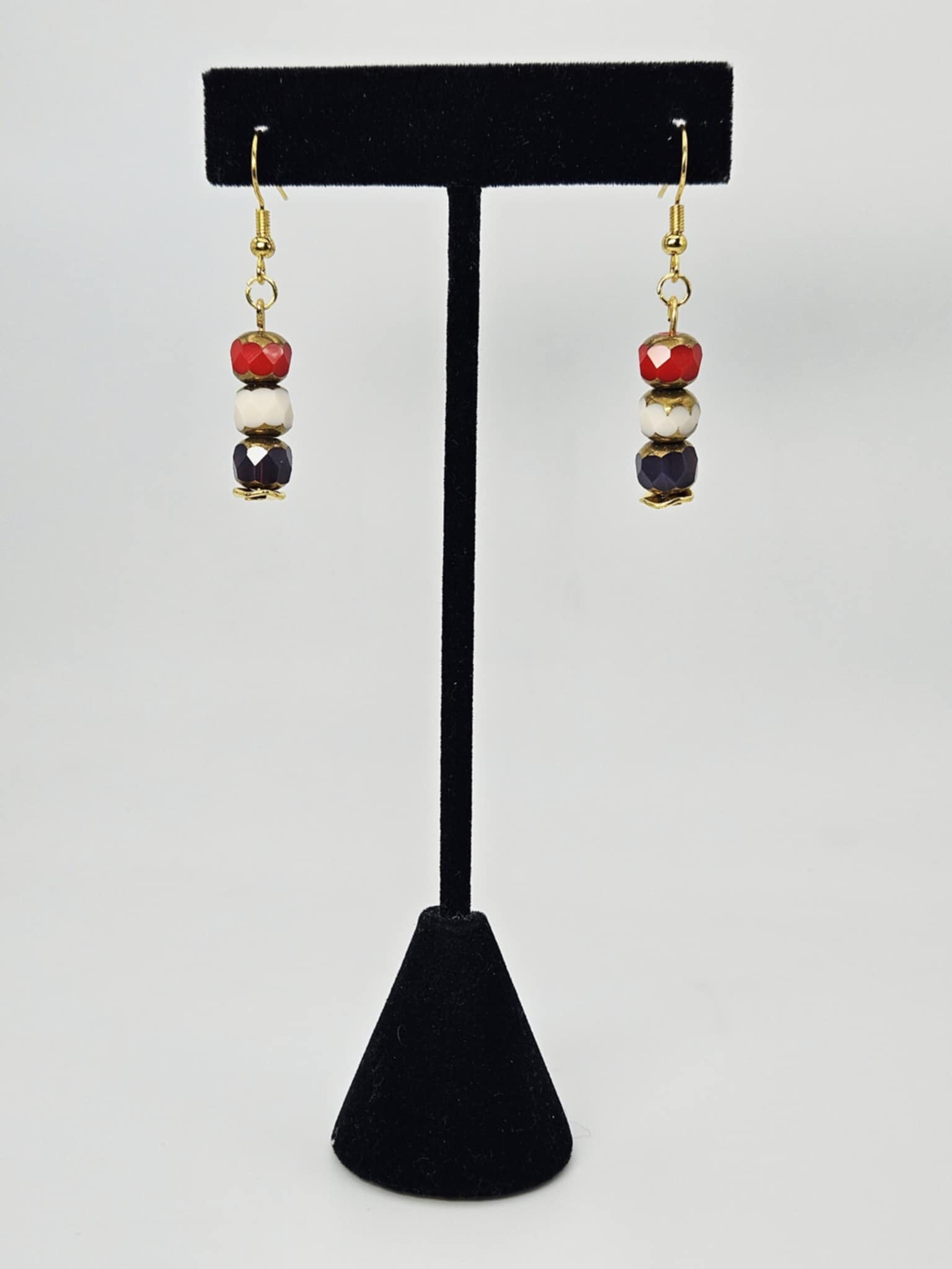 Hand beaded earrings with red, white and blue Czech beads with gorgeous gold glaze.